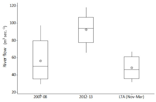 ANOVA analysis for flow to compare the same overwintering period revealed a statistically significant difference (p < 0.05; df =14) between monthly recorded LTA river flow and flows recorded in 2007–2008 and 2012–2013 (Figure 9). A t-test comparing monthly average flows for 2007–2008 with 2012–2013 for this overwintering period shows a statistically significant difference (p < 0.05; df = 7).