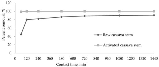 The adsorption capacity of both raw and activated carbon derived from the cassava stem was investigated. The results are illustrated in Figure 1. This figure showed that the concentration of MB dye decreased with an increase in contact time for both adsorbents. The high adsorption process was initially observed, starting from 120 min contact time for RCS. Meanwhile, a high percentage of removal was already observed at the first 60 min for ACS. Both samples showed a slight improvement in removal percentage at longer contact times and became almost constant at 24 h. The ease of accessibility of pores on the adsorbents caused a rapid adsorption process to occur at the initial contact time. There was a more minor improvement in adsorption percentage that occurred at longer contact time due to the bulky adsorbents that reduced the adhesion sites for adsorbates molecules []. It was observed that the adsorption capacity for ACS was higher than the RCS. The uptake amount increased by 55% at the initial 60 min after the cassava stem was converted into the activated carbon. This occurred as the high temperature in the activation process increased the pore size and volume of the cassava stem. Our previous study supports this fact, indicating a 0.765 m2/g surface area for raw cassava stem particles and a maximum surface area of 694.402 m2/g for cassava stem activated carbon []. Thus, the adhesion sites for adsorbates were increasing, which allowed more adsorbates molecules to be adsorbed onto the surface of the ACS.