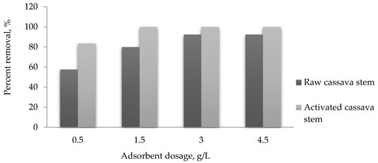 Adsorbent dosage effects on the adsorption of methylene blue onto raw cassava stem and activated cassava stem at Methylene Blue initial concentration of 100 mg/L, reaction temperature of 25 °C, and 1080 min contact time.