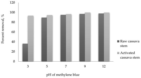 The initial pH of solution effect on methylene blue adsorption onto raw cassava stem and activated cassava stem at Methylene Blue initial concentration of 100 mg/L, the adsorbent dosage of 1.5 g/L, and reaction temperature of 25 °C and 1080 min contact time.