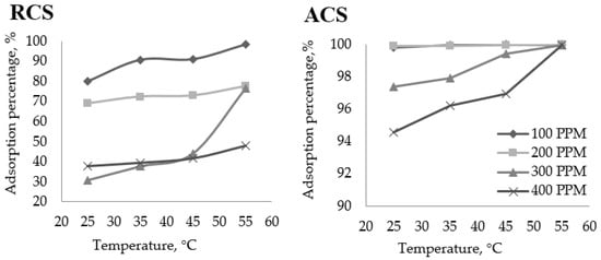 The effect of temperature as a function of the initial concentration of MB onto RCS and ACS is shown in Figure 4. These figures revealed that the adsorption of MB onto RCS and ACS was influenced by the temperature, in which high temperature gave a high adsorption percentage. This was due to the increment in the rate of diffusion of the solute through the liquid to the adsorption sites as the temperature increased, which led to the high adsorption capacity of the adsorbents.