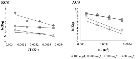 The thermodynamic study was conducted to evaluate the effect of temperature on the adsorption of MB on the cassava stem-activated carbon, while understanding the nature and feasibility of the reaction []. Adsorption was done at temperatures of 298.15 K, 308.15 K, 318.15 K, and 328.15 K with the adsorbate’s initial concentrations of 100 mg/L, 200 mg/L, 300 mg/L, and 400 mg/L. Plots of the plot of lnKq versus 1/T (K−1) were completed where T is the absolute temperature in Kelvin. The changes in standard enthalpy (∆H) and standard entropy (∆S) were then calculated, according to the following Van’t Hoff Equation (1):