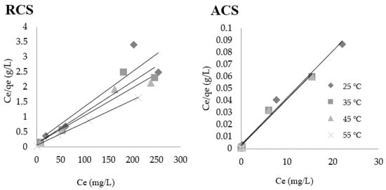 Plot of Ce/qe against Ce for the raw cassava stem (RCS) and activated cassava stem (ACS) fitted for the Langmuir equation done at temperatures of 25, 35, 45, and 55 with the adsorbate’s initial concentrations of 100 mg/L, 1.5 g/L of adsorbent dosage and 1080 min contact time.