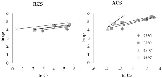 The plot of ln(qe) versus ln Ce for raw cassava stem (RCS) and activated cassava stem (ACS) for Freundlich isotherm fitting done at temperatures of 25, 35, 45, and 55 °C with the adsorbate’s initial concentrations of 100 mg/L, 1.5 g/L of adsorbent dosage and 1080 min contact time.
