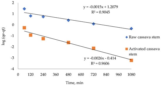 Plot of log (qe-qt) versus time for raw cassava stem and activated cassava stem. The experiment was done at 25 °C with an initial concentration of 100 mg/L for MB, 1.5 g/L dosage of the adsorbent and different contact times of 60 min, 120 min, 240 min, 480 min, 720 min, and 1080 min.
