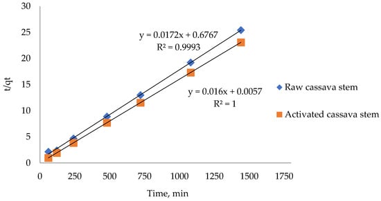 The plot of t/qt versus time for raw cassava stem and activated cassava stem. The experiment was done at 25 °C with an initial concentration of 100 mg/L for MB, 1.5 g/L dosages of the adsorbent, and different contact times of 60 min, 120 min, 240 min, 480 min, 720 min, and 1080 min.