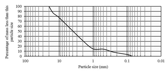 The typical mudstone in the Chongqing area was selected as the soil-rock mixture for the tests, and the moisture content test, particle analysis test, and compaction test were carried out, respectively. The maximum dry density of the test material was obtained as 2.206 g/cm3, and the optimum moisture content was 7.94%. The gradation curve of the soil-rock mixture was obtained by the particle analysis test, as shown in Figure 2. In our study, particles with a diameter of 5 mm–20 mm were defined as rock particles, and particles below 5 mm were defined as soil particles.