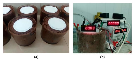 c. After reaching the equilibrium time, open the lid and put the measuring filter paper into the high precision balance with tweezers to measure the wet weight. Care must be exercised during the weighing process, and the time from opening the container to the end of filter paper transfer should be kept within 30 s. After transferring the filter paper, seal the container quickly to prevent the loss of water in the soil sample and put the filter paper into the drying box after measuring. The electrical resistivity of the specimen is then measured by inserting four titanium electrodes from top to bottom at the gap between the specimen and the mold, with the electrodes evenly distributed along the side of the specimen. The four electrodes are connected to the meter and power supply respectively according to the measurement circuit, and the output voltage is set and then connected to the circuit for simultaneous reading of the voltmeter and ammeter. Subsequently, the electrodes are switched and the circuit is changed for the second reading, as shown in Figure 3b. At the same time, the indoor temperature is measured to facilitate subsequent temperature correction of the data.