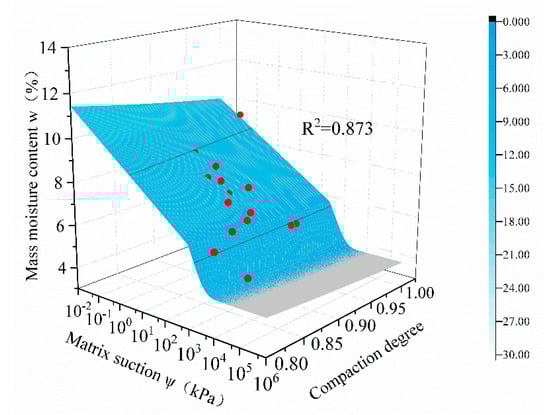 Since there is a large error between the actual compaction degree of the specimens produced by the compaction method and the target compaction degree, the soil-water characteristic surface model of coupled moisture content-matrix suction-compaction degree is used to fit the test data, and the specific expression of the mathematical model is: