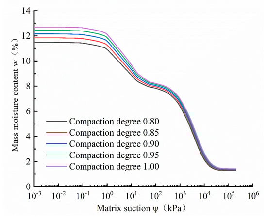 (1) The soil-water characteristic curve of the soil–stone mixture showed a double-step shape. The shapes of the curve under different compaction degrees were similar. Under the same suction conditions, the mass moisture content of the soil-rock mixture increased with the increase in compaction degree; under the same mass moisture content conditions, the matrix suction of the soil-rock mixture increased with the increase in compaction degree.