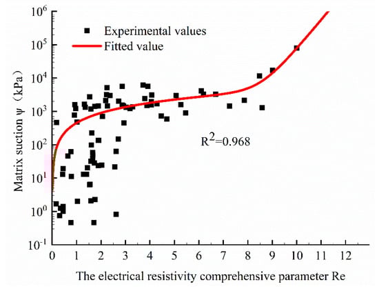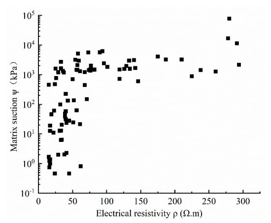 With the semi-logarithmic vertical coordinate indicating the matrix suction and the horizontal coordinate indicating the electrical resistivity, Figure 6 shows the relationship between the electrical resistivity of the soil-rock mixture specimen and the matrix suction . From the figure, it can be seen that in the 0 ≤ < 100 kPa range, the width of the data point distribution was 50, which meant that a certain determination corresponding to the had a large range of values, and the functional correspondence was not precise enough.