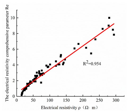 The electrical resistivity comprehensive parameter of the calculated values and the measured values of electrical resistivity are shown in Figure 7; a linear fit of the two was performed using Origin software, and the fitting formula was