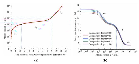 As can be seen in Figure 9, reflects the entire large pore drainage phase of the - relationship curve; at this stage, the water discharged from the large pores is about half of the total, and the moisture content of the soil at this time is higher, so the reflecting the electrical resistivity characteristics takes a low value, approximately equal to 2. reflects the large-scale drainage stage of the small pores of the - relationship curve; in this stage, the water discharged from small pores is about the same as that from large pores, but the increment of is about four times that of , which shows that increases with the decrease in , and the rate of increase increases accordingly. reflects the unsaturated residual phase of the SWCC curve; in this phase, the weak decrease in the moisture content of the soil increases the and rapidly, and the rate of increase exceeds that of the phase. Overall, the matrix suction and electrical resistivity keep increasing as the water in the soil decreases, and the lower the moisture content of the soil, the higher the corresponding growth rate of matrix suction and electrical resistivity.