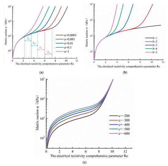 The matrix suction of unsaturated soils is the result of the combined action of soil structure, particle composition, particle arrangement, and moisture content, etc. Therefore, the structural parameters of soil electrical resistivity were combined to form a electrical resistivity comprehensive parameter that could be used to represent the electrical resistivity characteristics of the soil and reflect the intrinsic variation law of matrix suction [31]. Zha [32] proposed the electrical resistivity comprehensive parameter in the study of electrical resistivity parameters of unsaturated soils, and its expression is as follows.