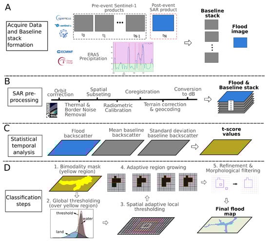 In this work we propose a robust methodological approach able to mitigate the abovementioned drawbacks and provide rapid and accurate flood maps. The proposed approach includes four steps: (a) baseline (pre-flood) dataset formation; (b) preprocessing; (c) SAR statistical temporal analysis; and (d) floodwater classification. The proposed pipeline is provided as a free open-source python tool [23] inspired by the free policy of Sentinel-1 data. The objectives of this work are to release a tool able to produce floodwater maps which mainly can be used for (a) flood damage assessment for fast responses, (b) calibration and validation of hydrological models, and (c) flood forecasting.