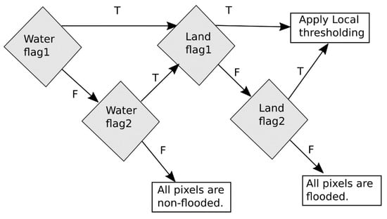The similarity flags (Water_flag1, Land_flag1) were calculated using a non-parametric two-sample Kolmogorov-Smirnov test with 95% confidence ratio [33]. The comparison flags ((Water_flag2, Land_flag2) were calculated by utilizing the Fisher discriminant ratio [34]. In order to ensure that the local thresholding can improve the scene-level thresholding we follow the decision tree (Figure 2) based on the computed flag values.