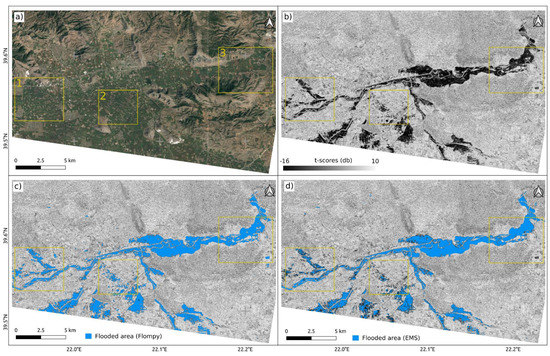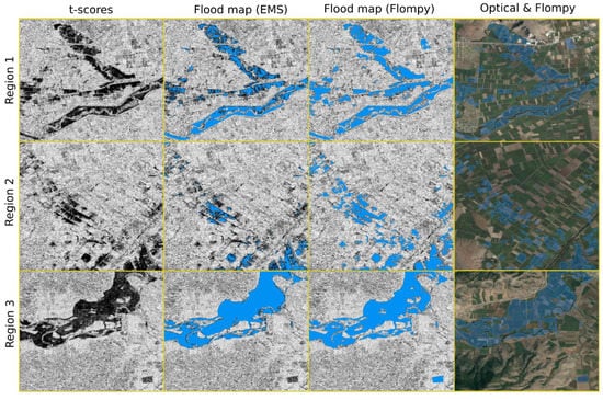 We strongly believe that the actual performance of the FLOMPY toolbox cannot be sufficiently depicted by only comparing with EMS products. The abovementioned statement is valid over the three selected regions (Figure 4a) where discrepancies between t-score map and EMS product are visible (Figure 5). Based on t-score images, EMS performance varies at each region. We point out that the omission errors of the EMS product affect the derived accuracy metrics and underestimate the actual FLOMPY’s performance. However, due to the lack of other validation data, EMS products were considered as ground truth data.