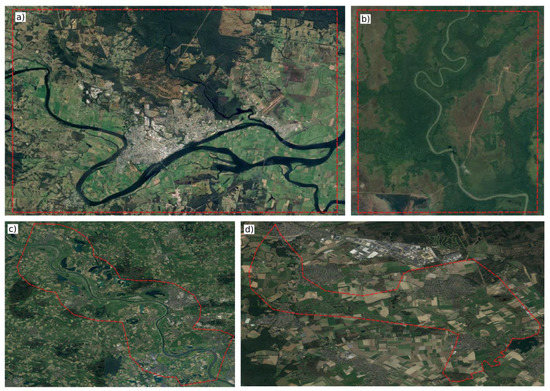 Optical Google earth imagery of validation regions over four EMS cases (a) EMSR504. (b) EMSR456. (c) EMSR497. (d) EMSR520. The validation regions are denoted with the red polygons.
