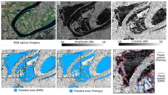 In Figure 4a, an optical image that covers a part of the area of interest is presented. This part will be used for validation purposes. We will focus in three regions to comment on FLOMPY’s performance. In Figure 4b, we can visually identify the open floodwater regions with high negative values (dark tones) in the t-score map. The high negative values correspond to a big negative change to the backscatter characteristics of these regions that are connected with the change due to flood event. In Figure 4c, we can visually verify the strong agreement of the FLOMPY results with the dark regions of the t-score map and with the EMS product.