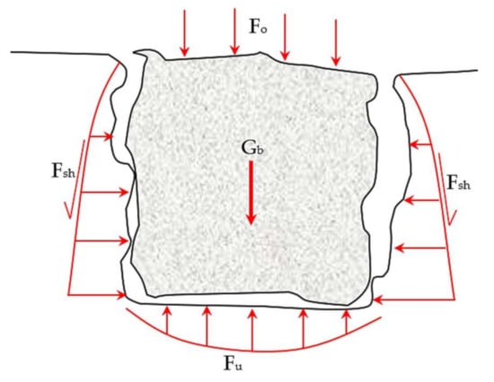 Erosion by the removal of blocks is a process that depends on the water pressure within the joints of the fractured rock mass. The amplitude of the fluctuating pressure changes with time during a turbulent flow, and the pressure applied inside the rock joints can increase pressure directly below the blocks. Moreover, the rock mass is eroded by the dynamic expulsion of the blocks when the lifting pressure under the block exceeds the resistance force of the block in the rock mass (Figure 1). The parameters affecting the resistance of the block are the submerged weight of the block , the pressure on top of the block , and the shear resistance along the sides of the block .