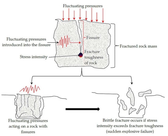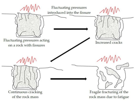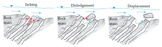 The second mechanism enabling the erosion of a rock mass is brittle fracturing or instant hydrofracturing. This mechanism occurs when the intensity of the fluctuating pressure-induced stress in the joints is greater than the resistance of the rock, and, hence, the rock mass breaks into small pieces owing to fragile failure (Figure 2).
