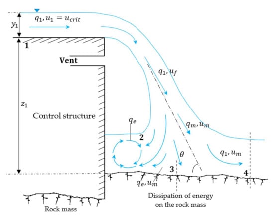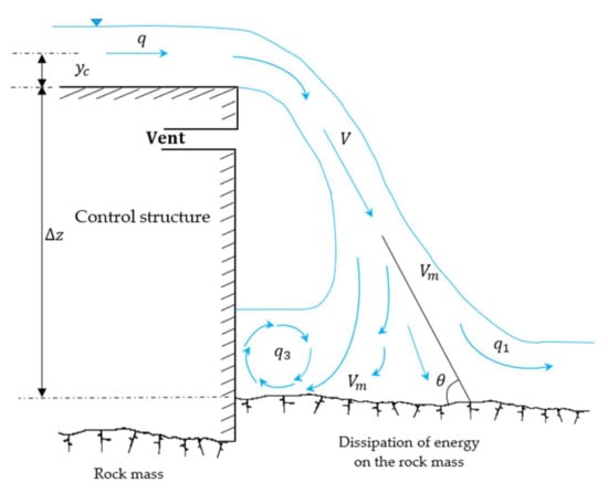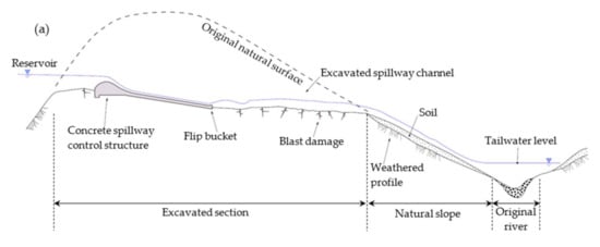 Several spillways around the world have been designed and built involving a combination of a discharge channel and a dissipation or stabilization zone. Examples of these combined spillways include the Robert-Bourassa dam spillway (Baie-James, QC, Canada) and the Hell Hole dam spillway (Placer County, CA, USA) []. Moreover, in most cases, the dissipation structures are excavated into the rock mass, including the plunge pool or the combination of an evacuation channel and dissipation zone. An important aspect of these unlined spillways is the phenomenon of hydraulic erosion of rock mass. For these spillways, the proper estimation of the erosive force of water is critical.