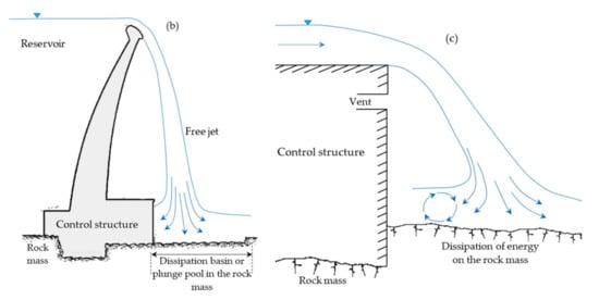 The energy of the discharging water must be dissipated before returning to the river; therefore and depending on the operational mode of the specific spillway, these structures are equipped with a flow channel or a transition zone between the end of the profiled threshold and the final dissipation zone of an evacuation structure (Figure 4a). In other cases, a simple basin, constituting a plunge pool, dissipates the energy immediately at the foot of the spillway (Figure 4b,c). The flow channels dissipate and direct the torrential regime flow toward the final dissipation zone. In this latter case, the observed flow modes differ depending on the nature of the channel, i.e., flows on an inclined slope, hydraulic jumps, flows at knickpoints, and plunging flows into the receiving pool.