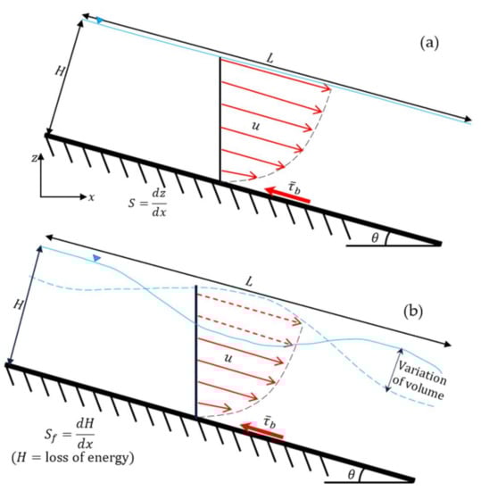 The velocity profile of a fluid is proportional to the applied shear force, and the linear proportionality factor is the dynamic viscosity [,]. Given that the viscosity of water is well known, the average shear stress at the bottom surface of a flow channel therefore mainly depends on the variation of flow velocity, which is a function of the nature of the flow. The calculation of shear stress varies, however, depending on the type of flow. The shear stresses for a uniform flow depend on the slope of the flow channel. In the case of non-uniform flow, the total energy gradient is used to estimate the shear stresses in the channel. Figure 5 illustrates possible cases of the distribution and variation of flow velocity. The cases depend on the nature of flow; in the first case, the velocity of a flow is uniform (Figure 5a), whereas the second case has a variable velocity for a non-uniform flow (Figure 5b). Depending on the nature of the flow, shear stress on the bottom of the channel can be estimated using either Equation (1) or Equation (2):