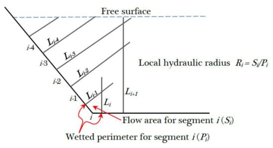 where is the dynamic viscosity of water, is the flow velocity, is the hydraulic radius, is the slope of the channel equal to , is the distance along the channel, is the elevation above a datum, is the gravitational acceleration, is the angle of inclination of the channel, and is the total energy gradient equal to , and is the energy loss by friction (in m) over distance L, which can be determine using Equation (19) (Section 3.2).