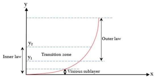 According to this theory, the distribution of the velocity (u) along the normal direction (y) to the wall is correctly described by the internal law (or the law of the wall) where the viscous effect dominates and the external law (or velocity defects low) [,]. The expressions defined by these laws are: