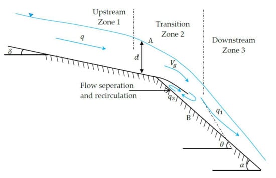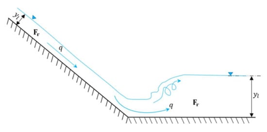 In summary, shear stress is a physical measure of the normal force applied to a channel. Shear stress is intrinsically linked to the nature of the velocity profile and indirectly represents many hydraulic characteristics. Pells [] selected the mean shear stress of the channel as an appropriate indicator of the erosive force of water. Van Schalkwyk [] and Pells [] demonstrated that the amount of observed erosion is well correlated with shear stress. Most researchers hold that the erosion caused by the flow of water in the channel is due to the shear stress exerted by the water at the bottom surface of the flow channel. However, Annandale [] showed that this notion is only valid for laminar flow; for turbulent flow, the erosion capacity of water depends on the pressure fluctuations exerted by the water rather than shear stress. Moreover, shear stress cannot explain all the probable mechanisms of erosion, including erosion by the dynamic expulsion of blocks recessed in a rock mass or erosion by fragile fracture of the rock mass into small pieces because of turbulent flow. In addition, the average shear stress in the flow channel is a hard-to-estimate parameter that can cause considerable uncertainty in estimates of the hydraulic head under differing flow conditions within the spillways (e.g., hydraulic jump). Most equations used to evaluate this parameter (Equations (5)–(17)) were developed for narrow, smooth-wall flow channels (e.g., pipes) and then applied analytically to other types of channels. Most of these equations have also been developed using assumptions that do not apply to spillway flow channels, including the homogeneity of the shear stress of the flow channel, the non-inclusion of secondary currents in a flow channel, and the non-differentiation of subcritical and supercritical flows. Finally, these methods are based on different assumptions, which can lead to an approach-dependent shear stress estimate. Their use in the cases of flow channels of spillways is therefore highly questionable.