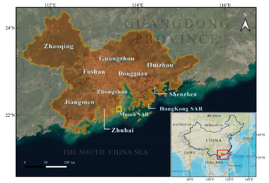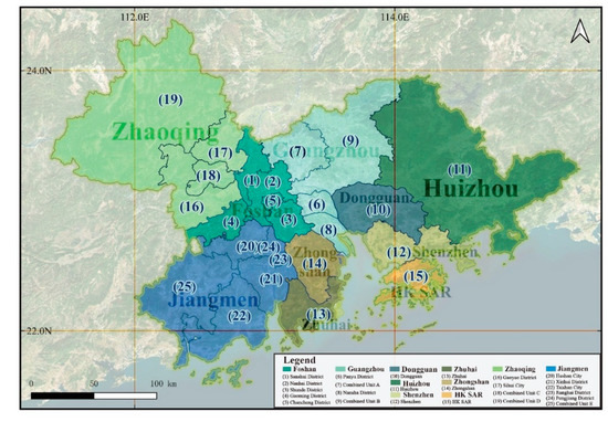 Administrative divisions of the Guangdong–Hong Kong–Macao Greater Bay Area (GBA). The study area covered the entire GBA. Because there are only a few fish ponds in Macau SAR, they were excluded in following investigations.