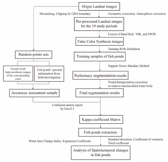 In total, 120 scenes of cloud-free Landsat images in the years1986, 1988, 1991, 1994, 1996, 1999, 2006, 2013, 2015 and 2019, were selected for fish pond delineation. Landsat-5 TM imagery were adopted from the 1980s to the 2000s, and Landsat-8 OLI imagery were used for the 2010s. Both of the two datasets have the characteristics of multiple bands and high spectral resolution, equipped with rich information and possessed 30 m spatial resolution [17]. The near-infrared band is extremely sensitive to vegetation and water bodies. Preprocessing processes include radiation correction, geometric correction, mosaic and extraction by GBA boundary were performed by the Landsat images preprocessing module provided by ENVI 5.3.