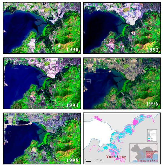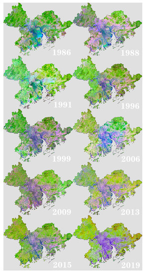 Some initial information can be obtained from these pre-processed images (Figure 5). Regarding image quality, it can be seen that the image quality of the early Landsat satellite images is somewhat lower than the recently acquired Landsat OLI images. It can be clearly seen that the early satellite images were fuzzier than the latest ones, indicating more noises in these images. In addition, it was observed that the urbanization in the GBA has experienced rapid development. The built-up area (in purple color) has substantially expanded.