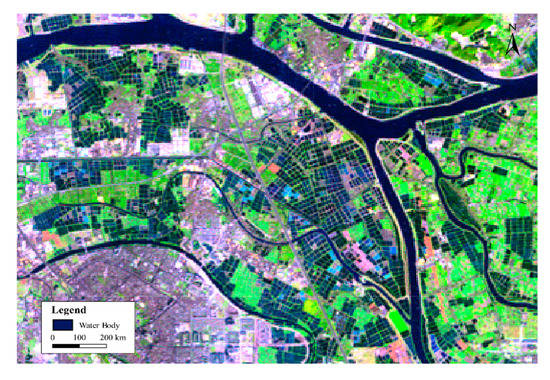 After the pre-processing of the images, the standard images in the study periods were obtained (Figure 5) to perform classification by the support vector machine algorithm. Figure 6 showed the representative patterns of waterbodies in Landsat images. The areas in blue or black colors with a clear rectangular or square boundary are fish ponds, while the rivers that extends in strip shapes.