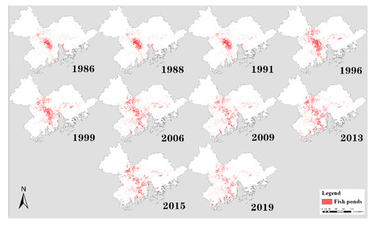To respond to the research gap, based on the Landsat images obtained in the period 1986–2019, this study conducted the investigated the long-term spatiotemporal changes in fish ponds and their landscape dynamics to reveal fish ponds’ historical development in the GBA. The study results will be valuable for a more comprehensive understanding of the water ecosystem dynamic development in the GBA in past decades. In addition, influencing factors were analyzed to provide an accurate reference for decision making on pond ecosystem restoration and conservation.