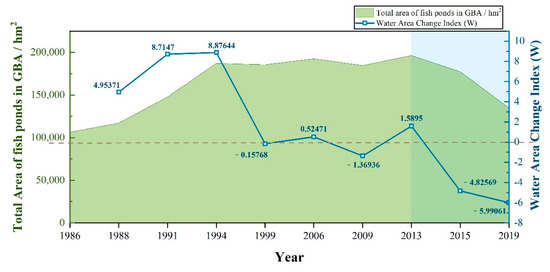 Figure 7 shows the overview of pond dynamics over the 10 periods in GBA. Based on the water area change index (W) in Figure 8, it can be seen that the total pond area firstly showed an incipiently increasing trend, followed by a decreasing trend. The fluctuation of W is basically consistent with the evolution of fish ponds in the GBA. From 1986 to 1994, fish ponds demonstrated a continuous rise from 106,603 hm2 to 187,153 hm2, which is an enlargement of with a total of area of 80,550 hm2 or a relative increase of 75.5%. Accordingly, W also performed an accelerated expansion and peaked in 1994. Since then, the areal change fluctuated within a small range until 2009, which means that fish ponds were under a relatively stable status during that period. In 2009, the area fell slightly to 184,589 hm2, accompanied by an increase, and reached the maximum value of 196,326 hm2 in 2013. After that, there was a decreasing trend from 2013 to 2019, with an average annual shrinkage of 10,242 hm2; meanwhile, W also maintained a negative growth. By 2019, the area had shrunk to 134,874 hm2 with an overall decrease of 31.3%, but the total area was still larger than 1986.