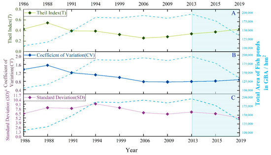 Fluctuation of three statistical indices compared to the areal changes of fish ponds from 1986 to 2019. (A): Theil index (T); (B): coefficient of variation (CV). (C): standard deviation (SD).