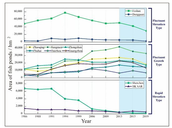 In 1986, Foshan had the largest number of fish ponds, followed by Zhongshan and Zhaoqing. However, by 2019, Jiangmen has become the largest, followed by Foshan and Zhaoqing. Considering the area of the fish ponds and the overall areal variations at the initial and the end of the study period, the prefectural cities can be roughly divided into the following three categories: