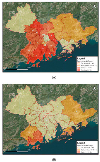 The spatiotemporal patterns in areal dynamics in the study units in the two different stages: (A) the first stage from 1986 to 2013; (B) the second stage from 2013 to 2019.