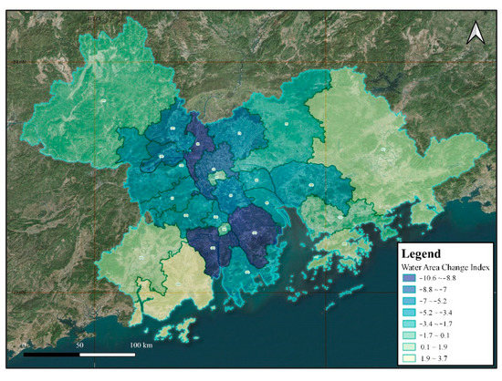 Distribution of each unit for waterbody area change index in GBA from 2013 to 2019.