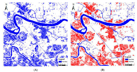 Previous studies have proved that the support vector machine (SVM) method has high interpretation accuracy in fish pond extraction [22]. This could also be seen in Figure 13A that the water body delineation using SVM was satisfactory.