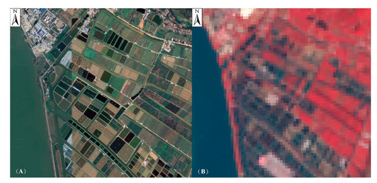 Fish ponds in Google Earth high resolution image (A) and Landsat image (B).