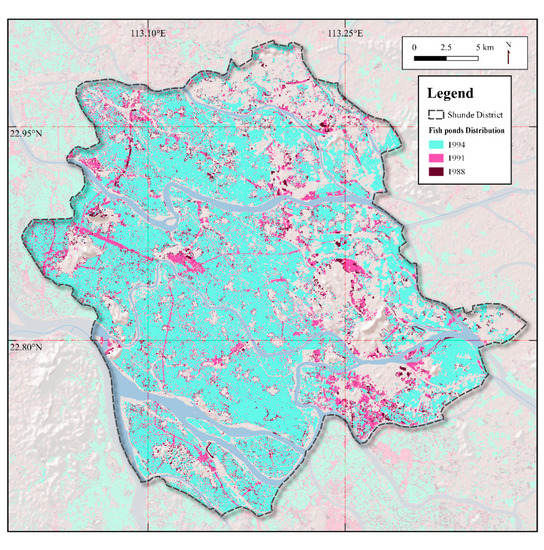 Previously, few studies were conducted on fish ponds in the entire Guangdong–Hong Kong–Macao Greater Bay Area. Many studies have been conducted in a specific city or a smaller area. Therefore, in the comparison, previous study results were compared with our results from the same specific areas. Previous studies about trends of dyke-ponds between 1978 and 2016 in Shunde, a district of Foshan City located in central GBA, reported that the spatial distribution of fish ponds in Shunde did not greatly change during 1988 and 1993 [24]. It was concluded from the comparison of fish pond distribution between these two years. Completing the gap of the time series by adding the fish ponds distribution in 1991 (Figure 15), we found that during this period, fish ponds in the eastern Shunde experienced a dramatic decrease, lost a large number of ponds, most of which disappeared in 1991.