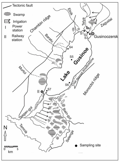 Following seasonal variation, the concentrations of Na+ and SO42− increased at sites S1–S6 during to the occurrence of open water, which is due to the input of river water under anthropogenic impact and the runoff of mine waters. Seasonal changes in the content of these ions differ more than 1.5–2 times In contrast, at site S7, where the Tsagan-gol River flows into the lake, the concentrations of these ions do not differ significantly [32].