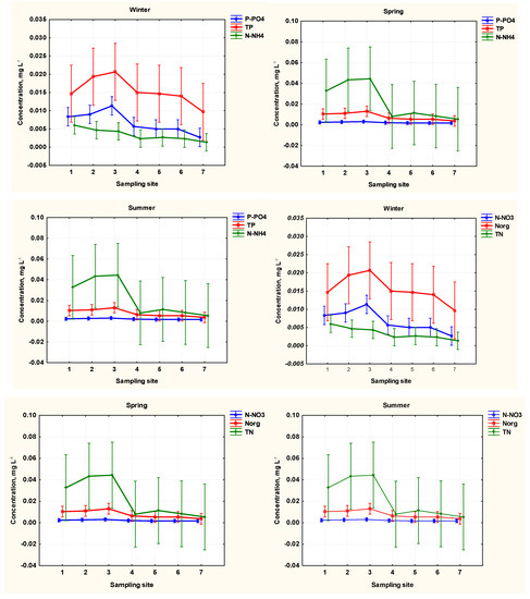 In order to highlight the difference between sampling sites, statistics multiple regression was applied. Figure 2 displays a significantly different distribution between the winter and water-open period of the obtained values, especially for P-PO4, N-NH4, and N-NO3. Higher concentrations were registered for P-PO4 and N-NO3 during the winter. The high concentration values of TP and TN could be observed at sampling sites S1-S3 during all the seasons. In the open-water period there, were no important seasonal or spatial variations in the P-PO4 and N-NO3 concentrations.