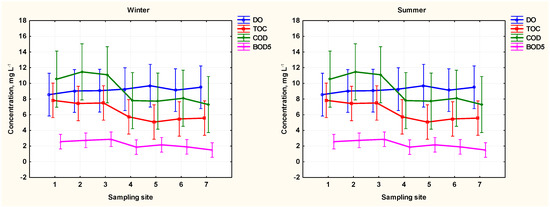 Organic matter. The organic matter (OM) concentrations varied considerably between different samples (Table 4). The OM composition during ice-free periods depended largely on the annual precipitation and hydrometeorological conditions, which control the intensity of the water exchange. Given the high precipitation during the spring of 2017, there were elevated levels of dissolved oxygen, DO (11.8 mg·L−1), chemical oxygen demand, COD (21.8 mg·L−1), and total organic carbon, TOC (16.2 mg·L−1), content. The concentrations of the chemical oxygen demand (COD) and biological oxygen demand (BOD5) were much higher in the summer, at 36,5 and 5.3 mg·L−1, respectively, compared to those measured in the winter. At the same time, for example, the concentration of dissolved oxygen (DO) exhibited a decrease in the highest concentrations from 10.8–11.8 to 9.3–9.8 mg·L−1 at sites S1–S3. The results of the statistics multiple regression are displayed in Figure 3. The distribution pattern indicates that organic matter (OM) concentrations were at the highest values at sites S1–S3.