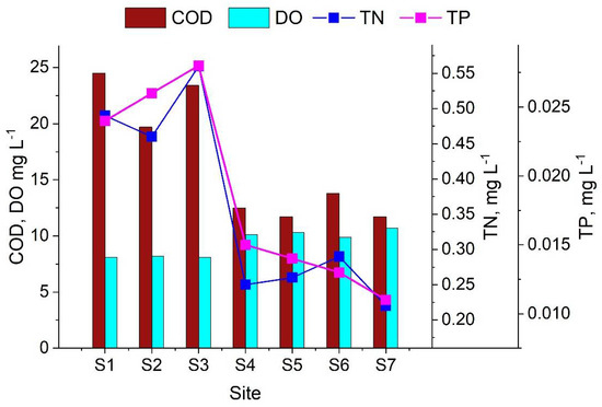 The varying concentrations of dissolved oxygen, chemical oxygen demand, total nitrogen, and total phosphorus at the sampling sites in the summer of 2016.