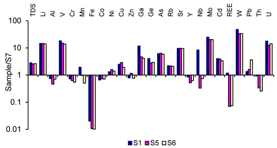 In order to assess the processes of vaporization and the anthropogenic impact, the concentration ratio of the trace elements at sites S1, S5, S6, and S7 were calculated. Sampling sites S1, S5, and S6 represented the anthropogenic impact and the central part of the lake with missing waters. Figure 6 displays the distribution of the concentration ratios.