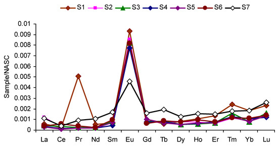 There was a difference in the value and sign of the Ce and Eu anomaly. The distribution of REE when normalized to NASC [45] is shown in Figure 7. Cerium anomalies were not observed at sites S1-S5 (Ce/Ce* = 0.089–0.342). The negative anomaly Ce/Ce* = 1.504 was recorded at site S6, which was due to the mine water of the coal-bearing Cholboldze deposit. The REE normalized profile was characterized by deeper positive anomalies (Eu/Eu* = 2.8–12.7). The lowest value (Eu/Eu* = 2.818) derived from the water from site S7, where the anthropogenic impact was minimal. The value of the Eu anomaly was positive correlated with TDS. From these results, it follows that the Eu anomaly is an indicator of anthropogenic influence and of the process of vaporization in Lake Gusinoe.